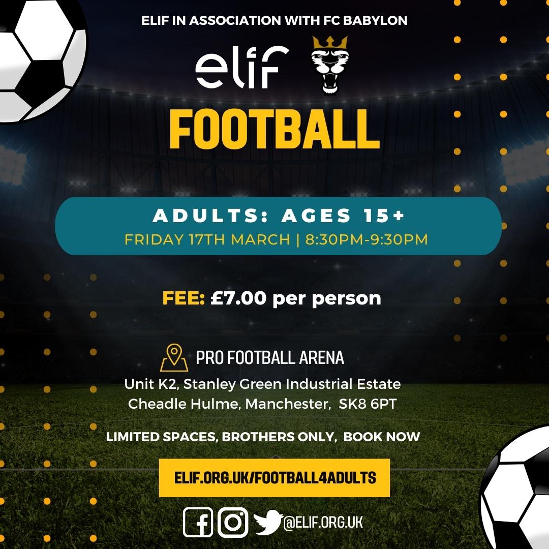 Elif Sports invites the youth to Football for brothers in an excellent indoor football facility in Cheadle, South Manchester. The venue has a seating area and Café facilities. Adults (15+) […]